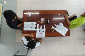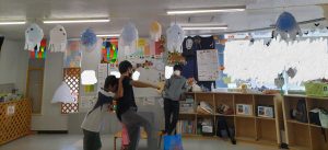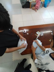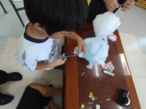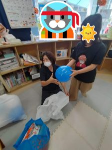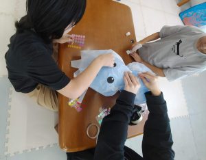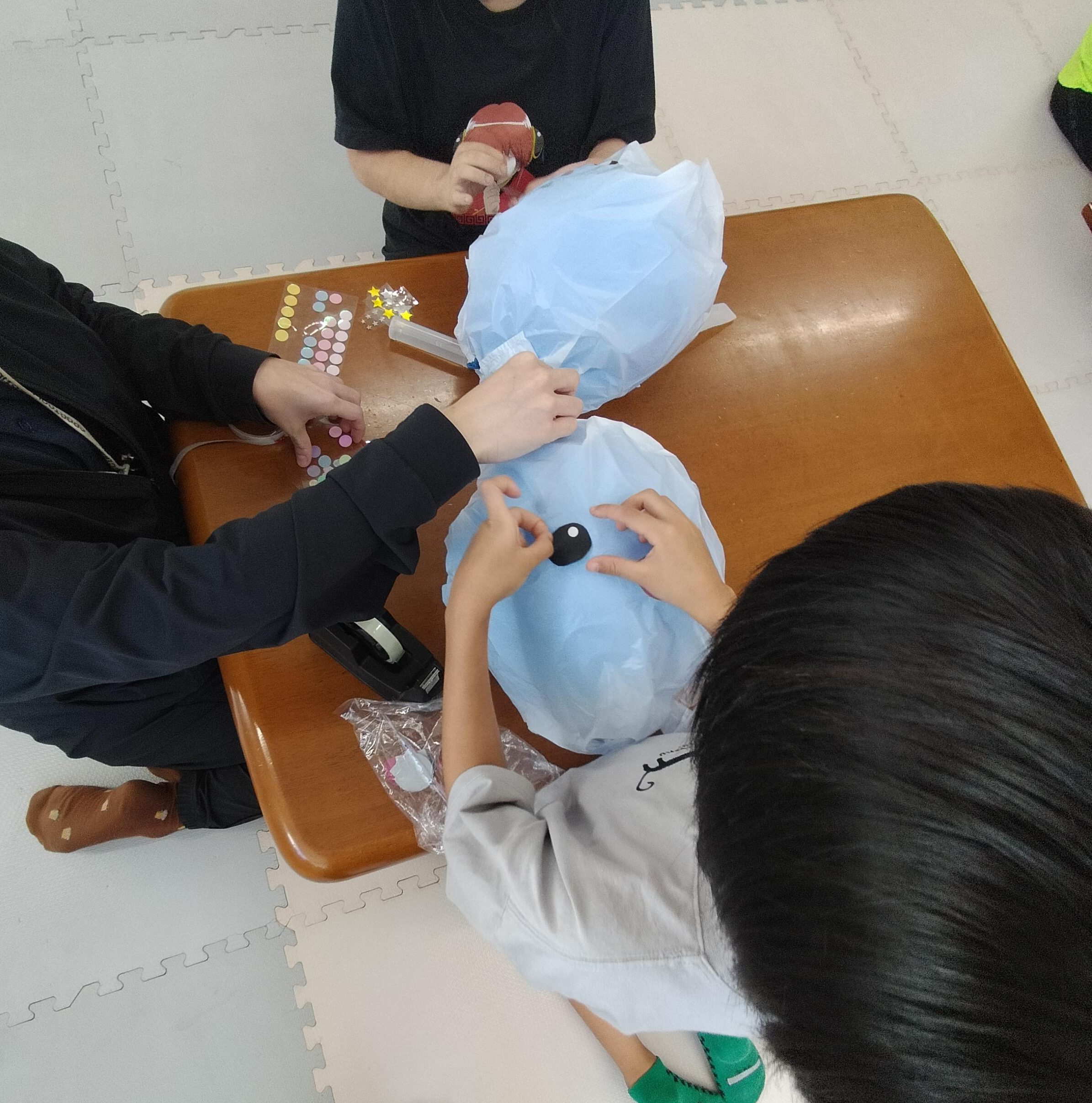 材料は、風船とレジ袋、輪ゴム、のり、色画用紙で作った「目、舌」、輪ゴム