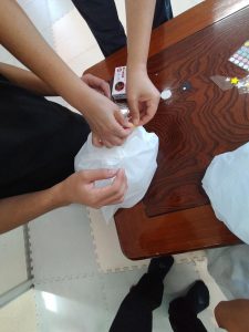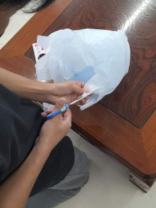 レジ袋に風船を入れる。 風船の口をレジ袋の底に開けてある穴から通し、輪ゴムを付ける。