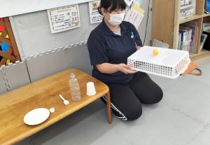 かご・ペットボトル・ペットボトルのふた・紙コップ・スプーン・お皿の6種類を用意し