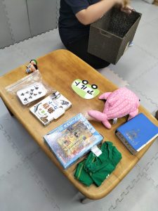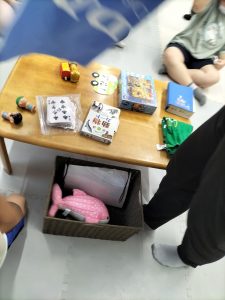 ぬいぐるみやパズル、食べ物カードやトーマスなど沢山物が置かれています。