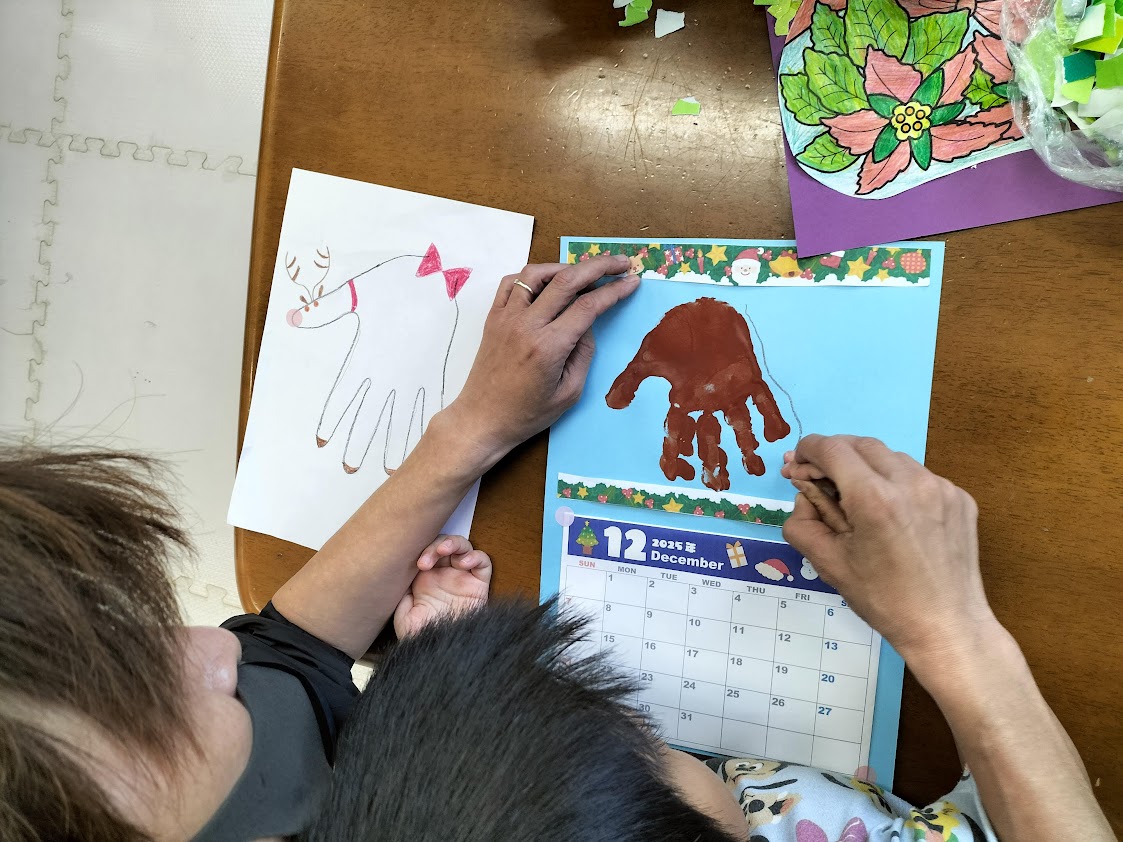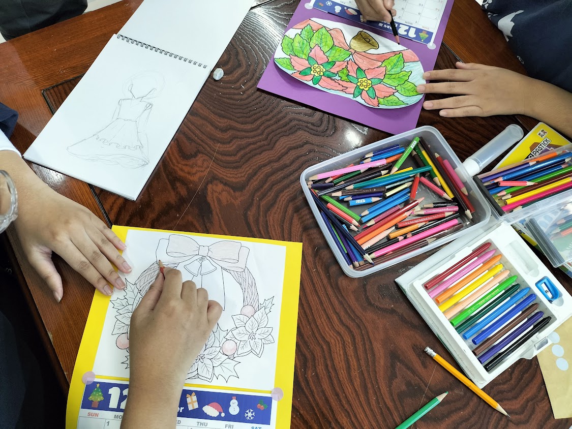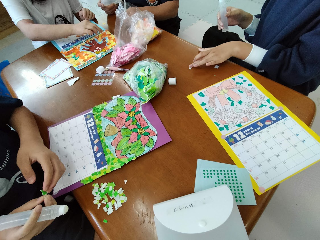 塗り絵チームは、塗り絵が貼られているカレンダーから