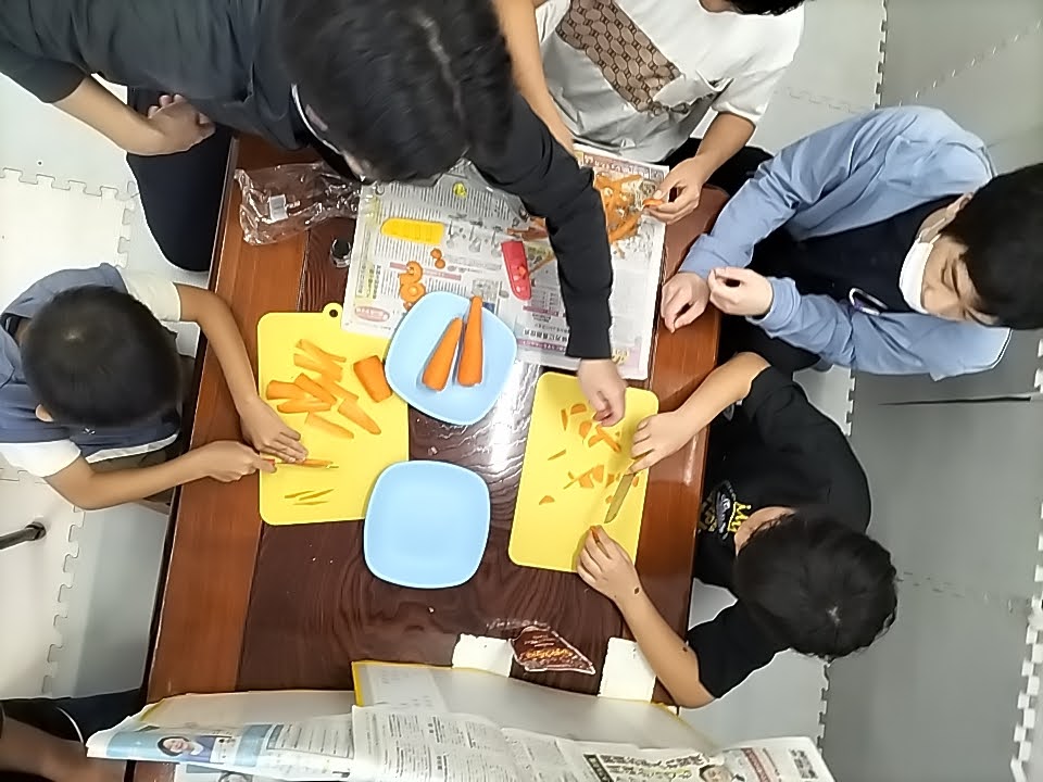 包丁を使い安全に気を付けて丁寧にニンジンをカット。