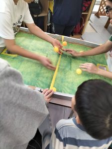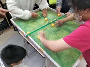 二人一組で制限時間内に相手のポケットに沢山ピンポン玉を入れたほうが勝ちです!