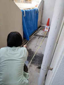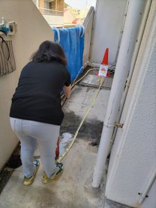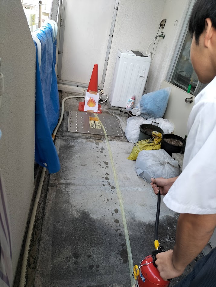 借りてきた消火器を用いてまはろのベランダで実際に練習してみます。