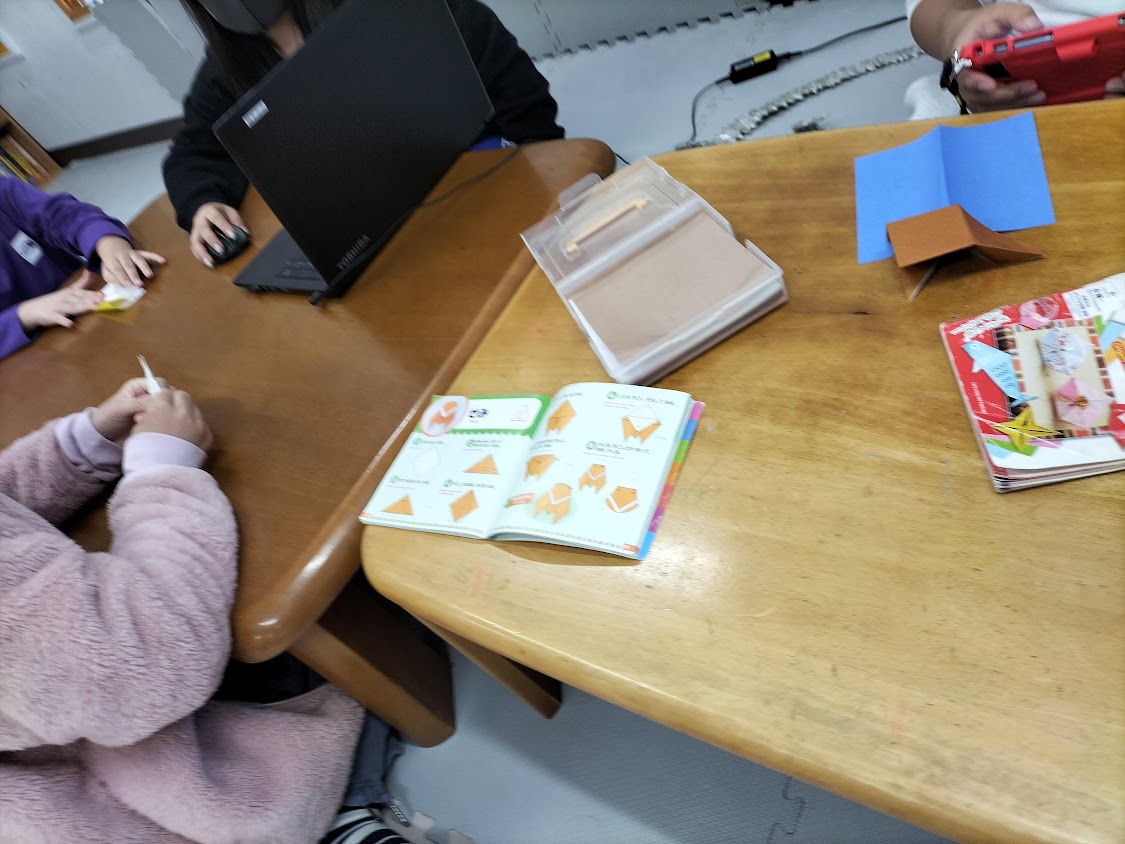 折り紙クラブは、自分が折りたい物を探して、せみや恐竜やバスなどを折りました。