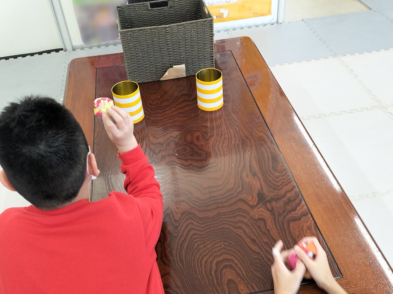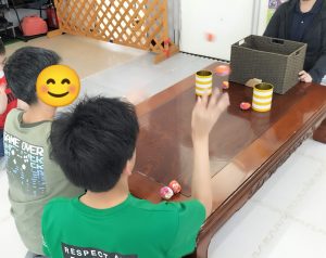 お手玉カップインでは、大きな箱からちょっと難易度の高い缶にもチャレンジ!
