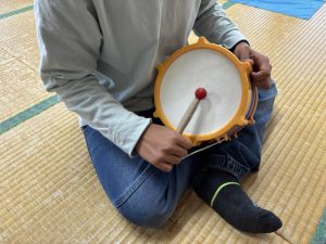 こちらは太鼓を見つけ音を叩いて音を楽しんでいます 😆