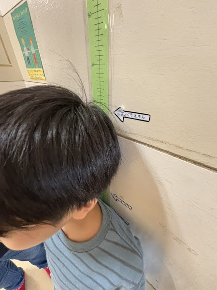 なんと児童館壁側に身長を測るメモリがあり、思わず測ってみると・・・