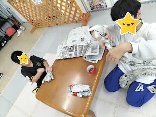 こちらは新聞紙を使って大好きな恐竜を作っていきます。