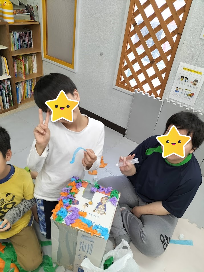 段ボールで土台を作り、カラフルな花紙を細かくちぎり、糊で地道にくっつけていきます。