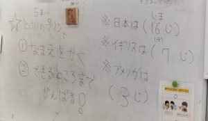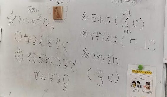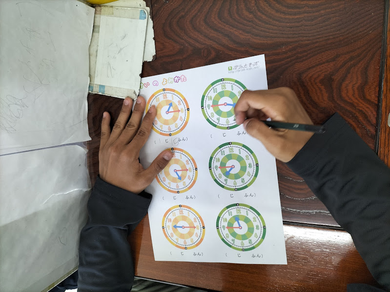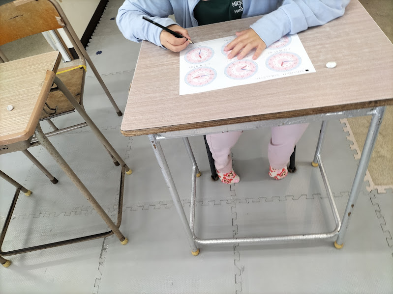 何時何分が記された時計の絵を見て答えるプリントを計5枚行いました。