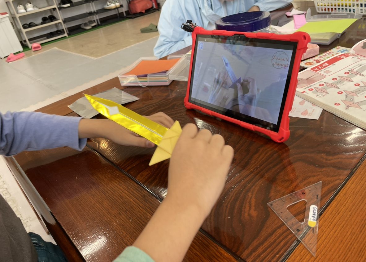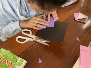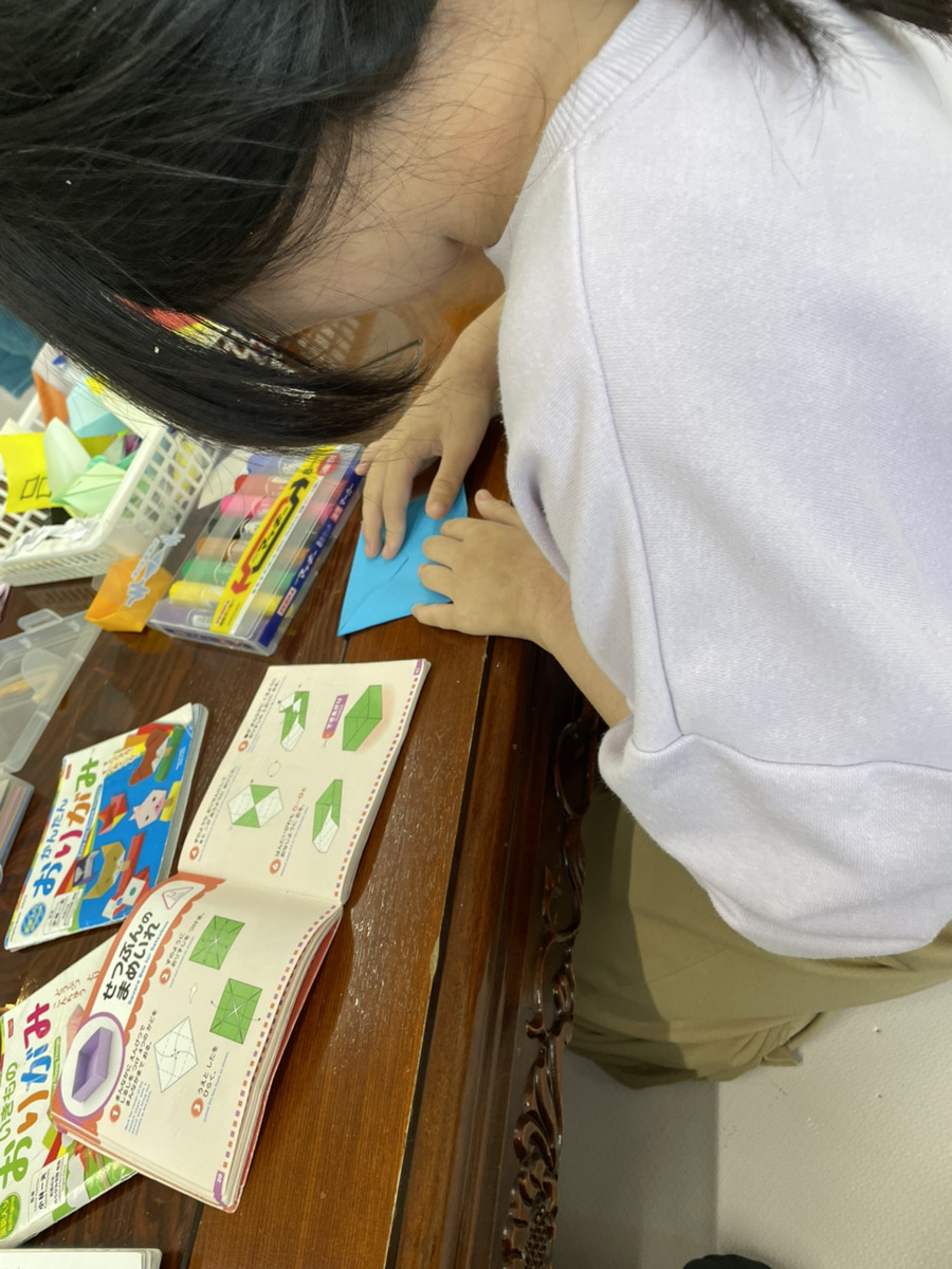 折り紙の本を見ながら丁寧に折り進めていきます。